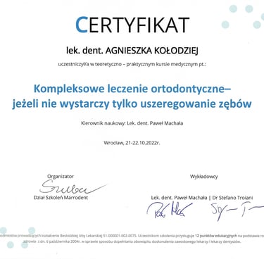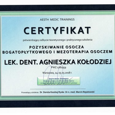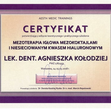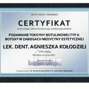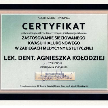 Agnieszka Kołodziej to serdeczna stomatolog z pasją do swojej pracy. Od zawsze marzyła o tym, aby pomagać ludziom i właśnie dlatego wybrała specjalizację w dziedzinie, która dotyka nas na co dzień. Agnieszka dba o komfort swoich pacjentów, zawsze stara się podchodzić do nich z wyjątkową empatią i zrozumieniem, tworzy przyjazną atmosferę i buduje trwałe relacje.